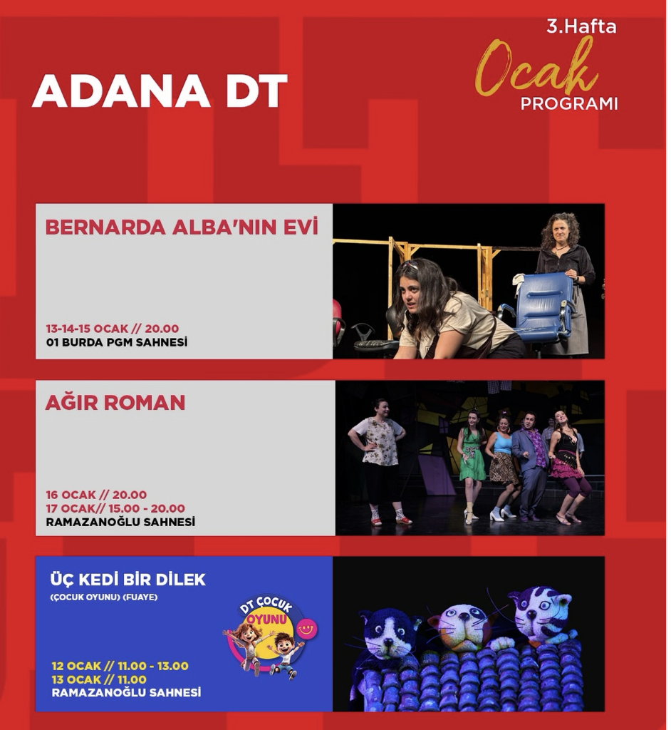 Adana Devlet Tiyatrosunda, Ocak ayında Bernarda Alba’nın Evinin yanı sıra Ağır Roman, Şekerpare, Çehov Aşkı, Komik Para ve Aşk Listesi seyirciyle buluşuyor.
