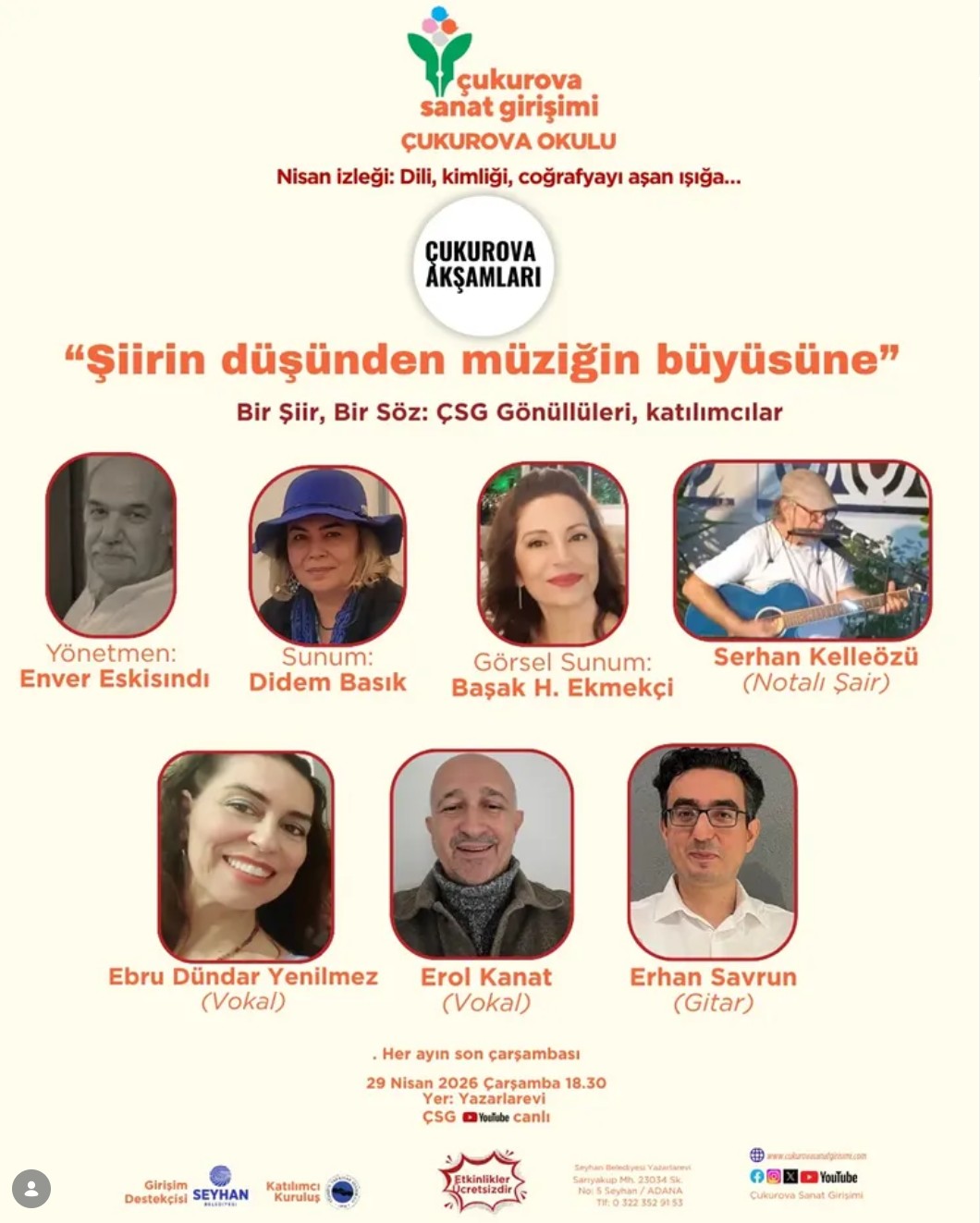 Çukurova Sanat Girişimi “Şiirin düşünden müziğin büyüsüne” 29 Nisan27 Nisan 2026EDEBİYATMÜZİKŞİİR www.instagram.com/p/DXQyXiGiMhA