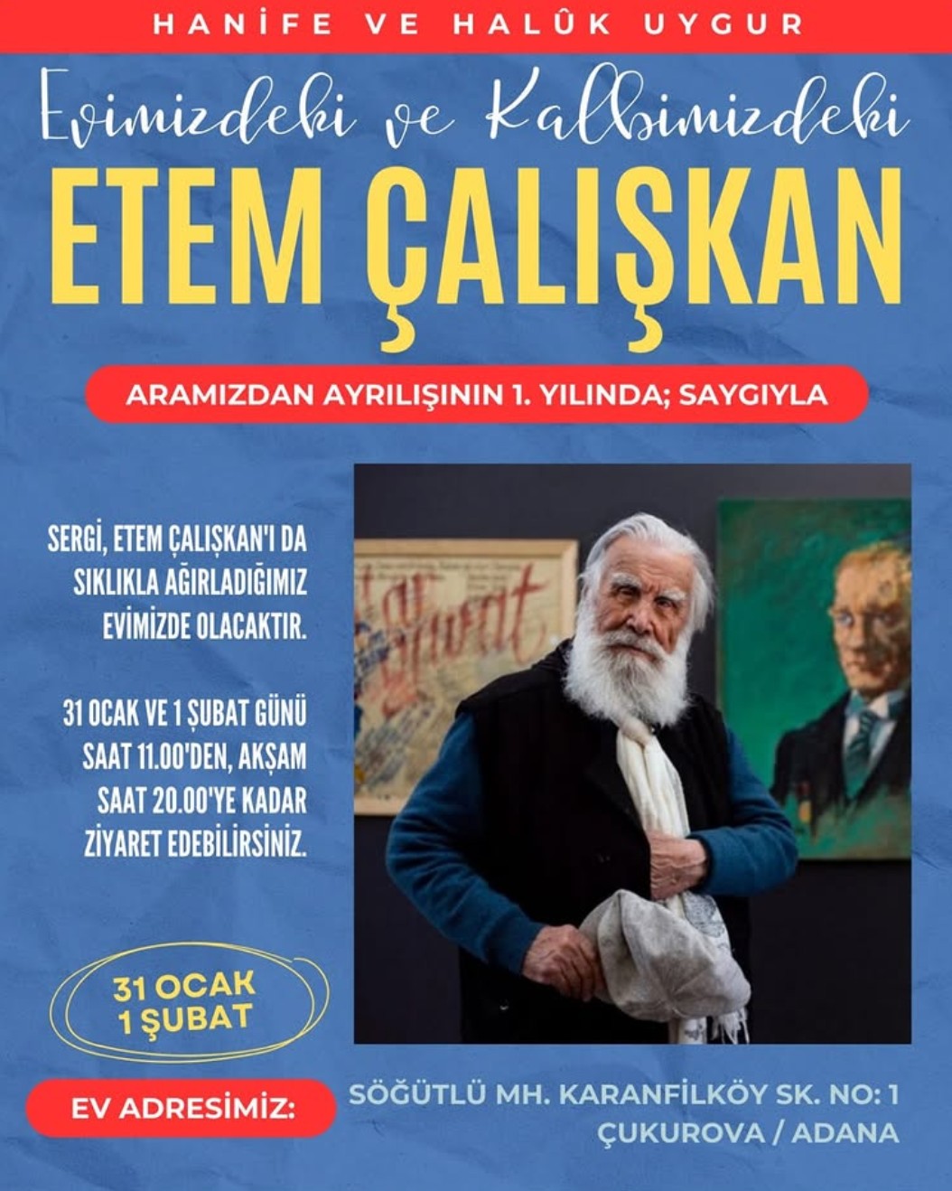 Anıtkabir’in hatlarını yazan, “K. Atatürk” imzasını kaligrafik olarak yorumlayan, Türkiye’nin en önemli ressamlarından Etem Çalışkan’ı anmak için, 31 Ocak ve 1 Şubat günleri saat 11.00’den, saat 20.00’ye kadar süren zaman içinde istediğiniz bir vakitte, EVİMİZDEKİ VE KALBİMİZDEKİ ETEM ÇALIŞKAN sergisini görmek için sizleri evimize davet ediyoruz.