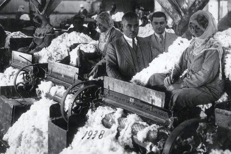 Bir zamanlar Adana, Mürşit Görgün’e ait Pamuk İşleme (Çırçır) fabrikası, Mürşit Görgün çalışanlar arasında (1938)